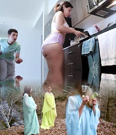 Busty Brunette Gets Deepthroated by Her Step-Brother in the Kitchen