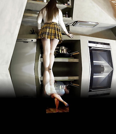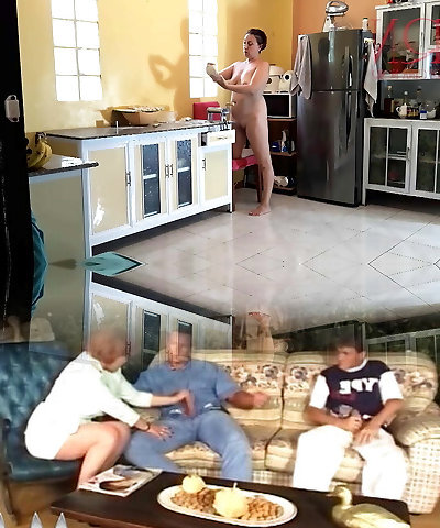 Busty Brunette Milf Shows Off Her Naked Body While Searching For Something In The Kitchen Cabinet